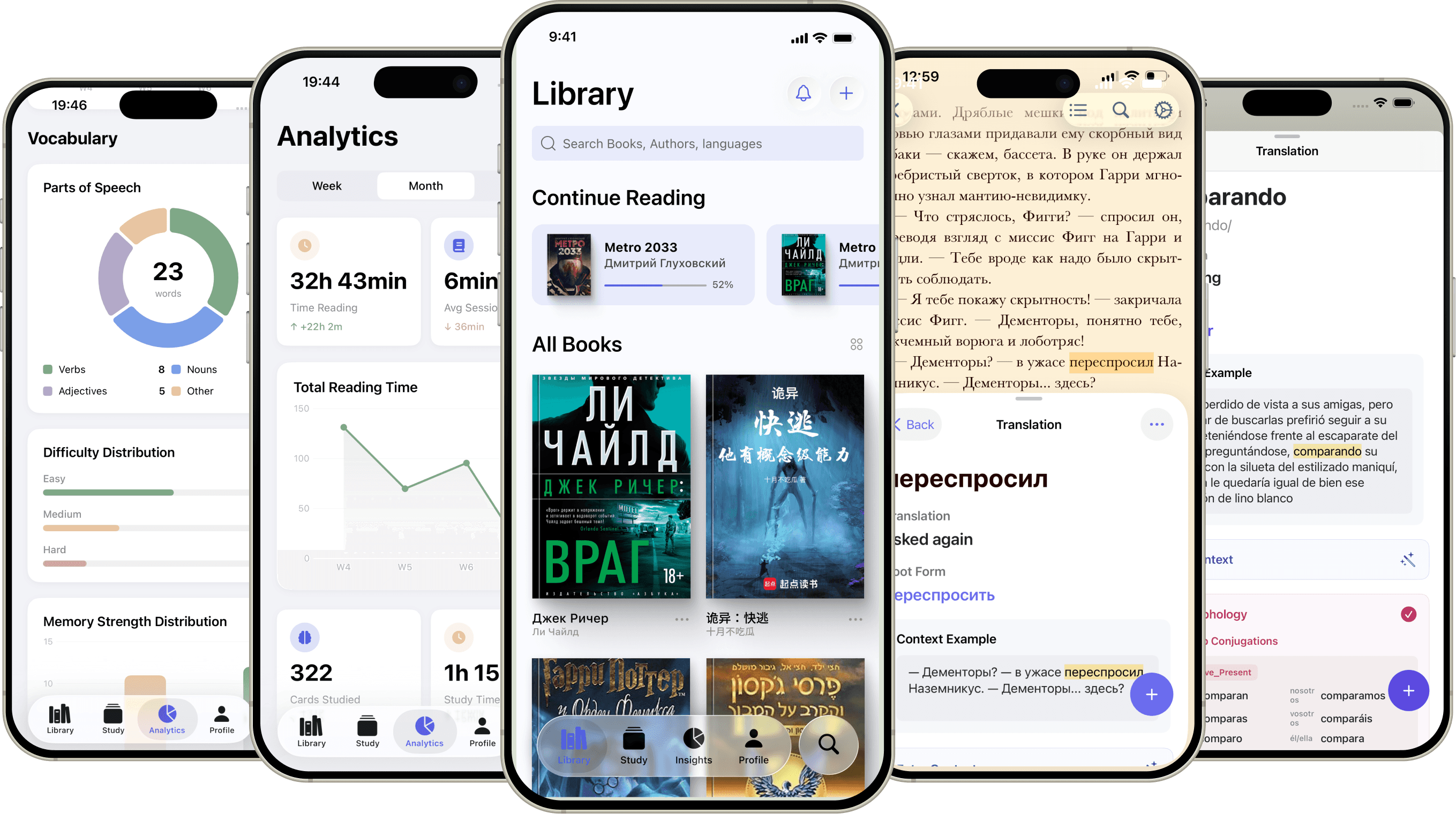 Unlimited books, advanced translations, spaced-repetition flashcards, and detailed analytics - all for you to take your language learning to the next level.